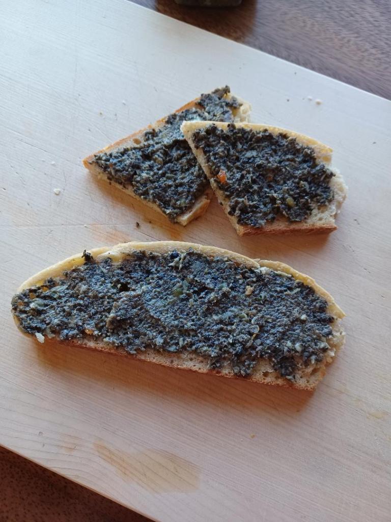 We made pizza last night, so we had chopped black olives in the fridge. Hmmmmm…..tapenade! If you aren’t familiar with it, tapenade is basically a spread/paste made with olives, capers, and a few other ingredients. If you search online, you’ll find a lot of different recipes. Some are more intricate, while others are simpler.