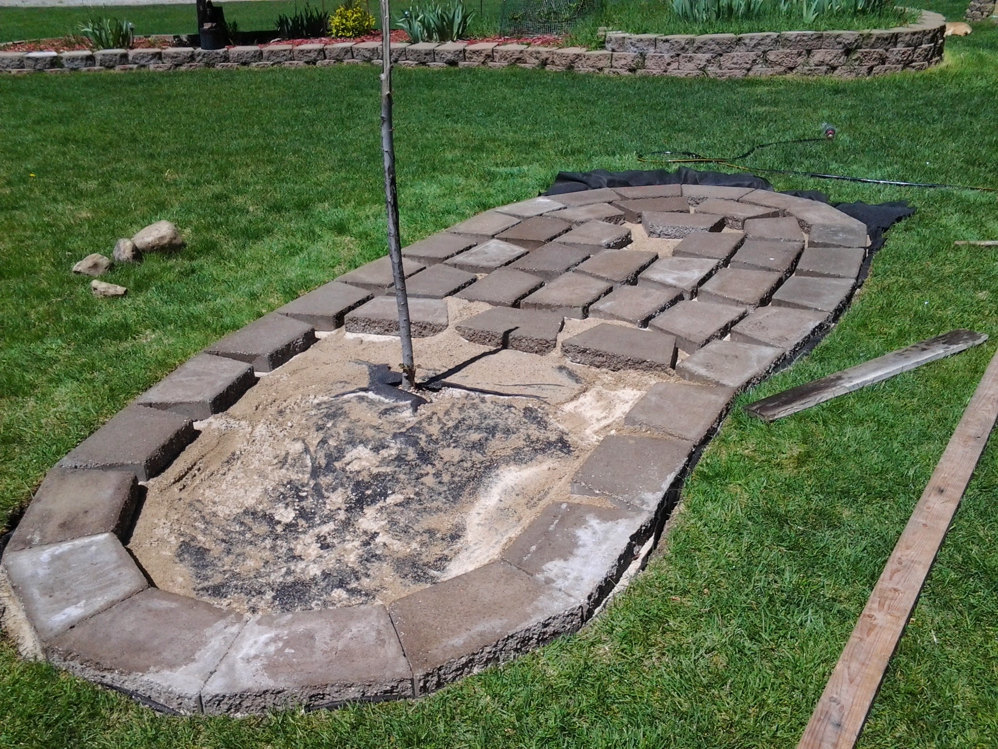 First step is to mark your spot and clear out the grass. Fill in with sand and pack it down as level as you can. You’re going for a base that will let your blocks be about grass height. Makes it way easier for mowing or trimming around the area.